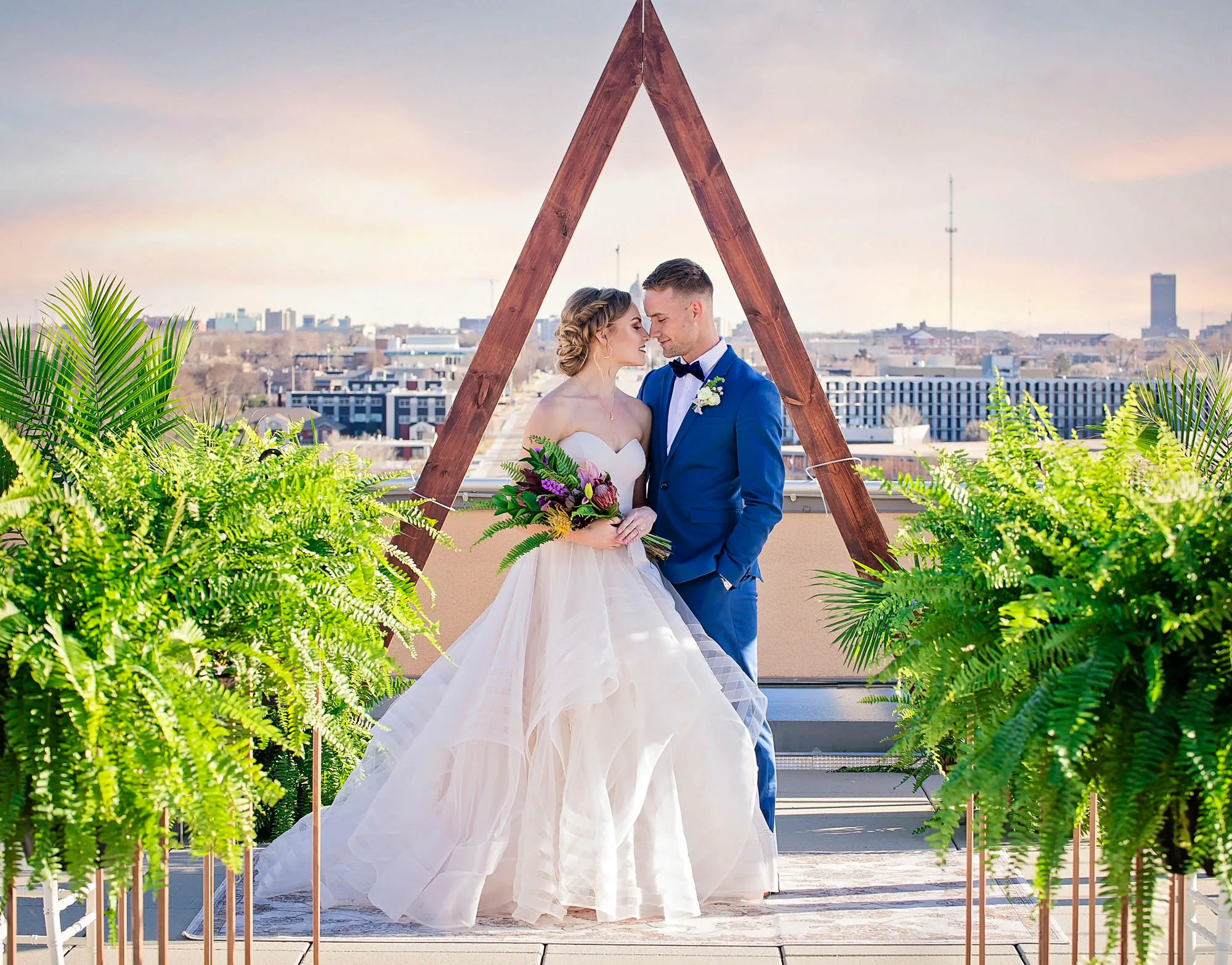 A modern event venue featuring a rooftop terrace with views of the State Capitol and downtown skyline, offering a versatile 'raw space' that can be customized for any event.